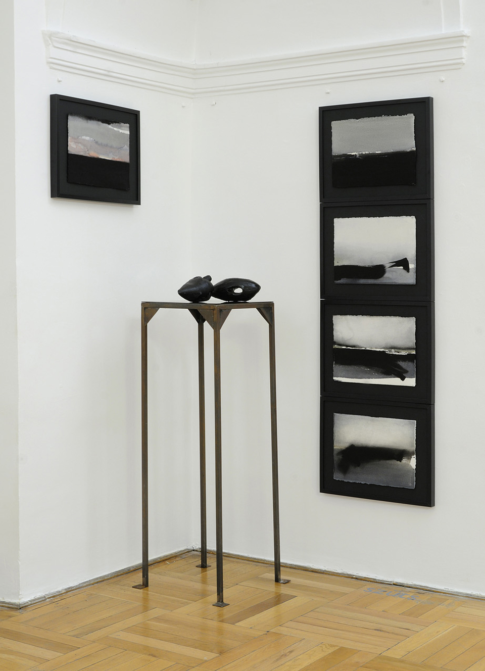 Szűts Miklós a tájról, a tengerről meditál akvarell képein. Ott jár, ahol a föld és az ég találkoznak. Ezek nem konkrét tájábrázolások, inkább improvizált kompozíciók a tájról. A teremtés hajnalán vagyunk, vagy éppen a haldokló Nap fényében fázunk: nem tudom. Az uralkodó fekete mellett megjelenik a kék, a zöld, természetesen a szürke, és egy-egy halvány fénysugár pirosban, rózsaszínben. A villogó fehérekkel ellenpontoz. Folyamata kettős: a fent és a lent, az ég és a föld hol egymásba folyva összeolvad, hol pedig a színek és a kontúros, amorf pacák révén szétválik, szétesik a világ.