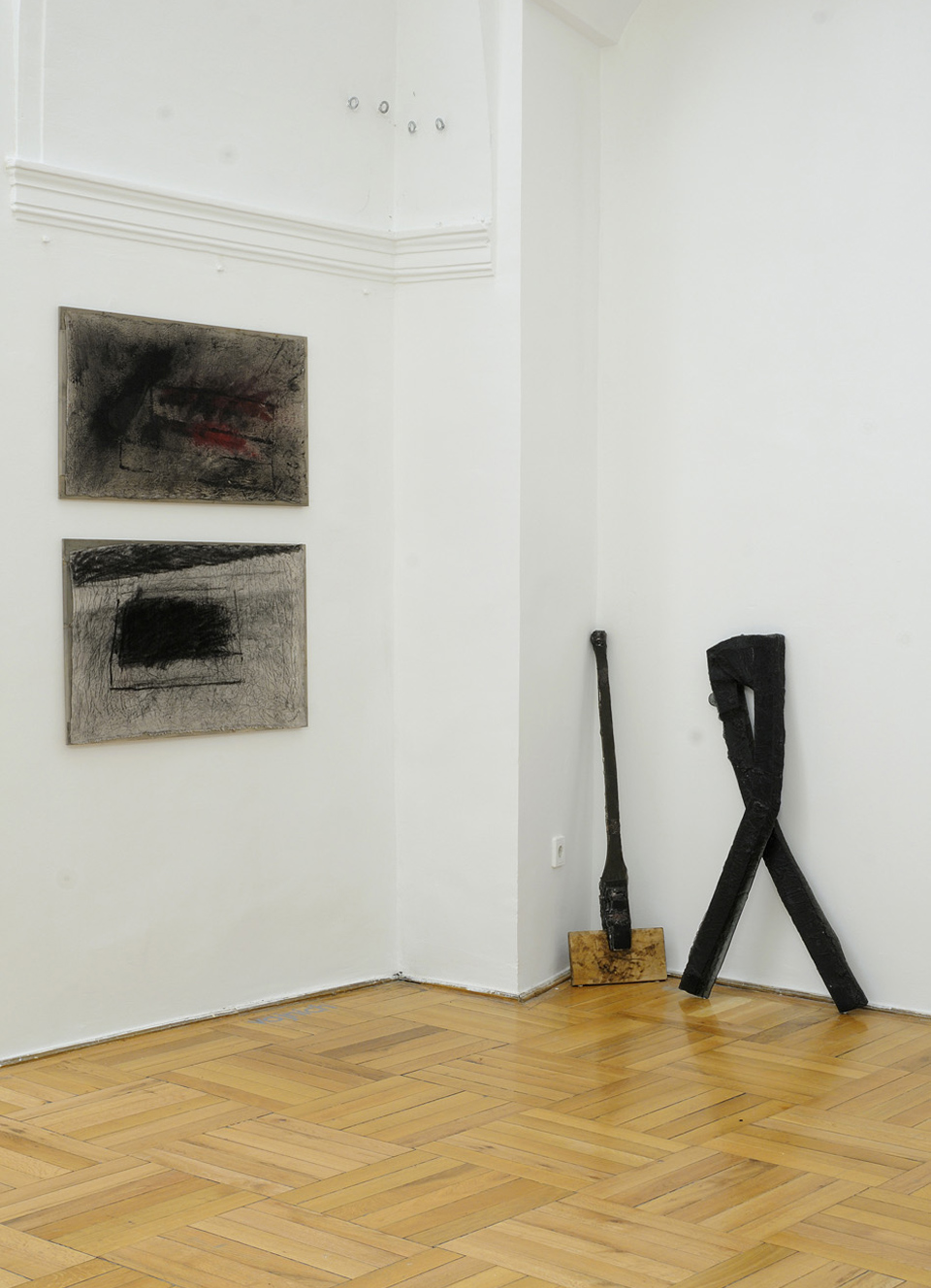 Tölg-Molnár Zoltán pigmentet, gézt, lakkfestéket cellulózt, alumíniumot, csavart egyaránt a kartonra/vászonra applikáló művein az anyag sokszor tésztaként szétterülve tördeli széleit: az idő harapdálja azokat. Az idő múlására emlékeztet a kétszer is megjelenő, a létigét ragozó latin nyelvű felirat. Van, ahol a fekete szaggatott kört rajzol, másutt a marokkó játékhoz hasonlóan szétesnek a falnak támasztott, földön fekvő lécek. A törékeny szélű elemek a gyógyítás szellemében ezüstös csavarokkal vannak bandázsolva. Formázott fekete vászna pedig nem a „shaped canvas” síkbeli deformációja, hanem a térbe nyílva hullámai felénk áradnak.